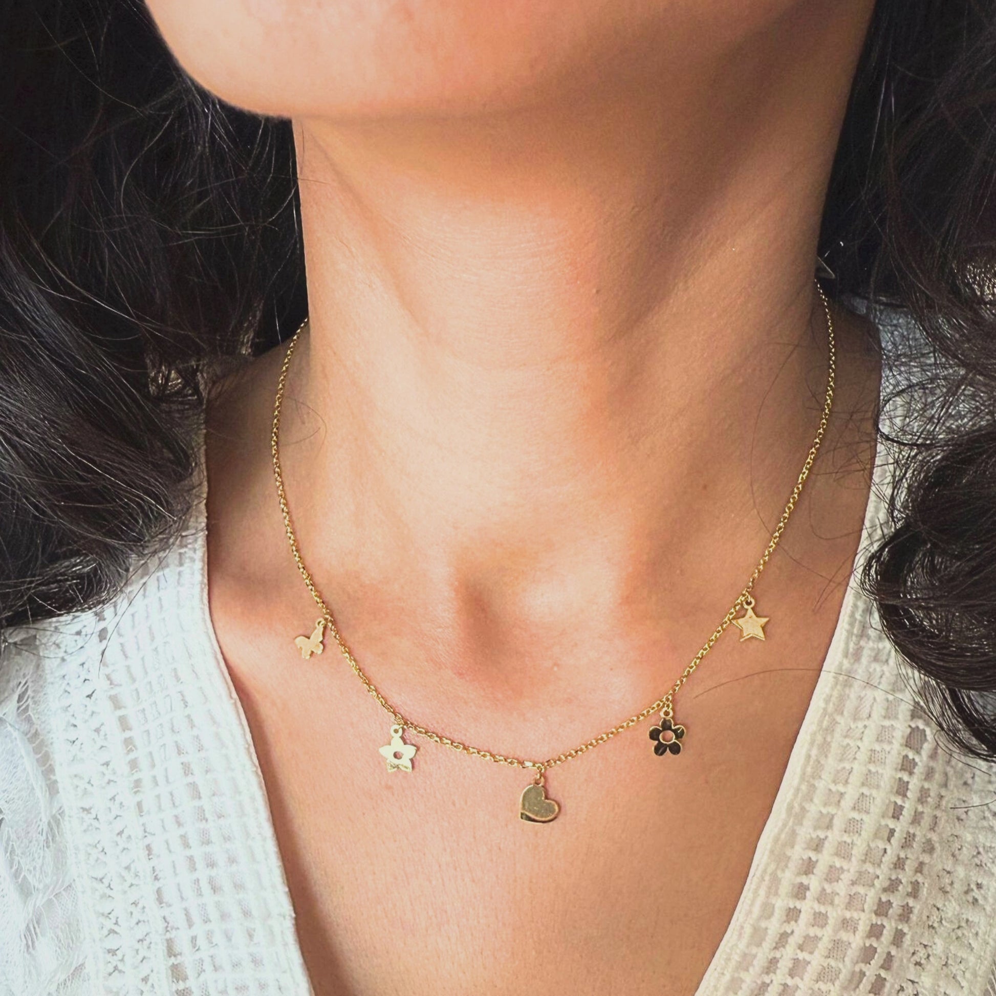 Add a touch of whimsy to your outfit with this 18k dangling necklace. Keep your look playful and chic with this unique accessory.